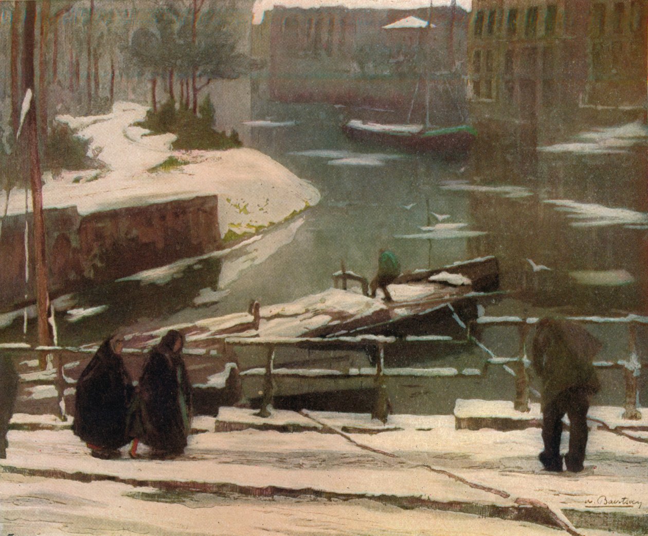 wetter · transport · transport · draußen · fluß · städtisch · jahreszeit · winter · frau · frauen · frau · leute · mann · mann · männer · boot · boote · fußgänger · schnee · kerl · brücke · geographie · belgien · farbe · farbe · tauwetter · kahl · kanal · jahrhundert · lastkahn · dame · konzept · publikation · wintry · gent · wassertransport · 1900s · 20. jahrhundert · landscape · albert baertsoen · baertsoen · albert · studio publications · studio volume 39 · The Print Collector/Heritage Images |