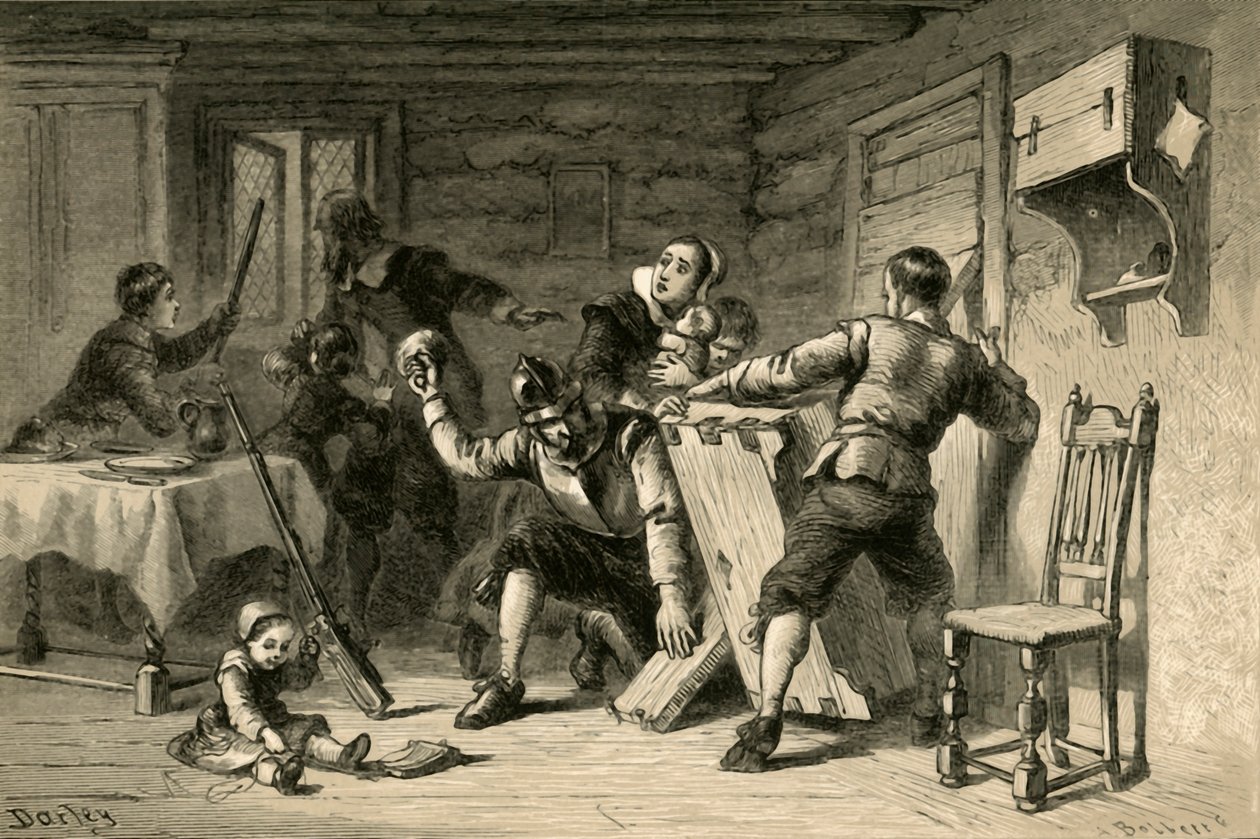 europa · gebäude · settlers · invaders · miles · occupied territory · albert bobbett · bobbett · albert · bobbett · alfred · alfred bobbett · darley · felix octavius carr · felix o.c. darley · darley · felix o.c. · felix darley · darley · felix · benson john lossing · lossing · benson john · benson j. · benson j · benson j. lossing · benson j lossing · johnson miles · johnson · colonists · gebäude · england · frau · frauen · frau · leute · mann · innen · mann · männer · haus · häuser · fromm · land · religion · kerl · besetzung · kontinent · werkzeug · waffe · waffen · gewehr · gewehren · englisch · europäisch · schießen · verteidigen · christentum · regelung · krieg · position · jahrhundert · kolonial · nagel · nägel · nach innen · invasion · dame · konzept · planke · hammern · europäer · einfarbig · barrikade · kriegsführung · holzhammer · 17. jahrhundert · protestantism · puritanisch · puritaner · eindringling · vereinigte staaten von ameri · siedler · 19. jahrhundert · zuhause · schwarzes u. weiß · schwarzes und weiß · kampfmittel · 19.jahrhundert · amerikanisch · geschichte · historisch · amerika · felix octavius carr darley · engraving · The Print Collector/Heritage Images