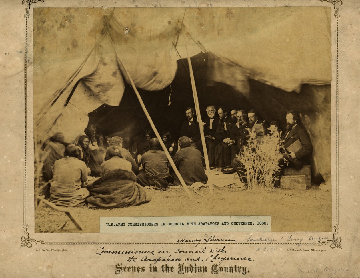 US-Armee-Kommissare im Rat mit Arapahoes und Cheyennes. Fort Laramie, Wyoming. Gen. William S. Harney und William T. Sherman(U. S. Army Commissioners in Council with Arapahoes and Cheyennes. Fort Laramie, Wyoming. Gen. William S. Harney and William T. Sherman)Alexander Gardner |