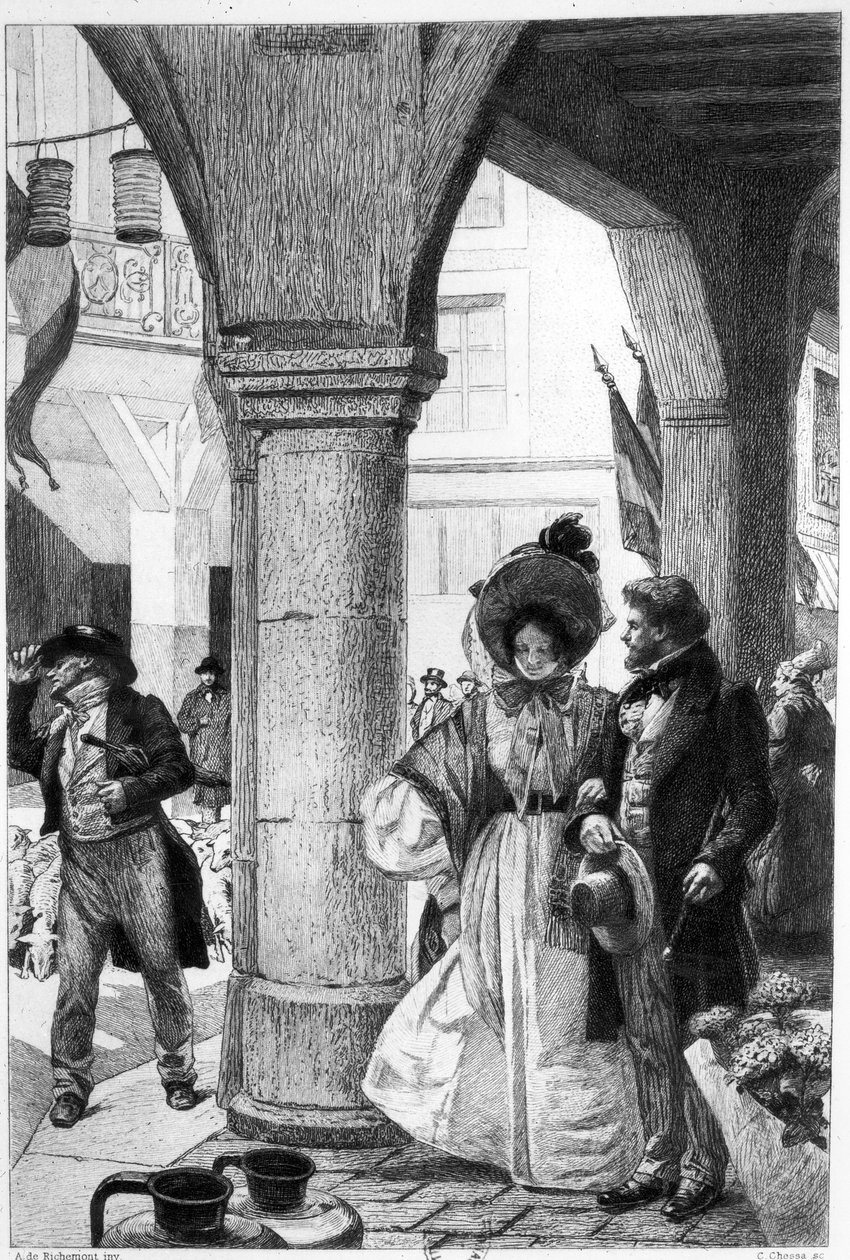 Emma Bovary spaziert mit einer Begleiterin aus 'Madame Bovary' von Gustave Flaubert, graviert von Carlo Chessa (1855-1925), 1906(Emma Bovary walking with a companion from 'Madame Bovary' by Gustave Flaubert, engraved by Carlo Chessa (1855-1925), 1906 )Alfred Paul Marie Richemont |