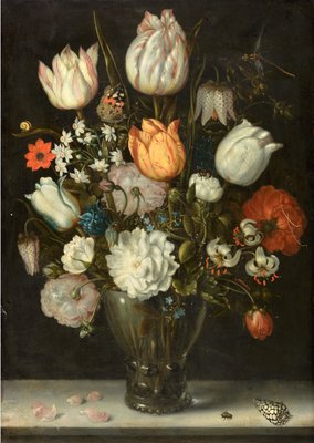 blume · tulpen · glockenblume · vergissmeinnicht · narzisse · maiglöckchen · rose · pfingstrose · alpenveilchen · ringelblume · perlmutter · iris · glasvase · schmetterling · biene · schlangenkopf · tulpe · Private Collection / Bridgeman Images