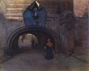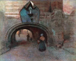 Tor unter der Vieille Boucherie, Antwerpen(Archway under the Vieille Boucherie, Antwerp (colour litho))Amedee (after) Forestier |