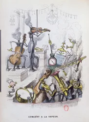 satire · satirisch · lärm · kanone · hammer · bass drum · tuba · messing · kontrabass · publikum · schock · horror · schockiert · kampf · empörung · unmusikalisch · musikalisch · musik · hand auf hüften · dirigieren · dirigent · schlagzeug · modern · moderne · orchester · orchester · karikatur · Musee de l'Opera, Paris, France / Bridgeman Images |