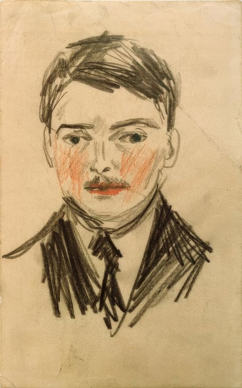 buntstift · blaue · reiter · deutsche · kunst · expressionismus · junger · mann · krawatte · maler · künstler · mann · person · portrait · schnurrbart · selbstbildnis · technik · grafik · handzeichnung · zeichnung · Selbstporträt · Bonn, Städtisches Kunstmuseum / akg-images |