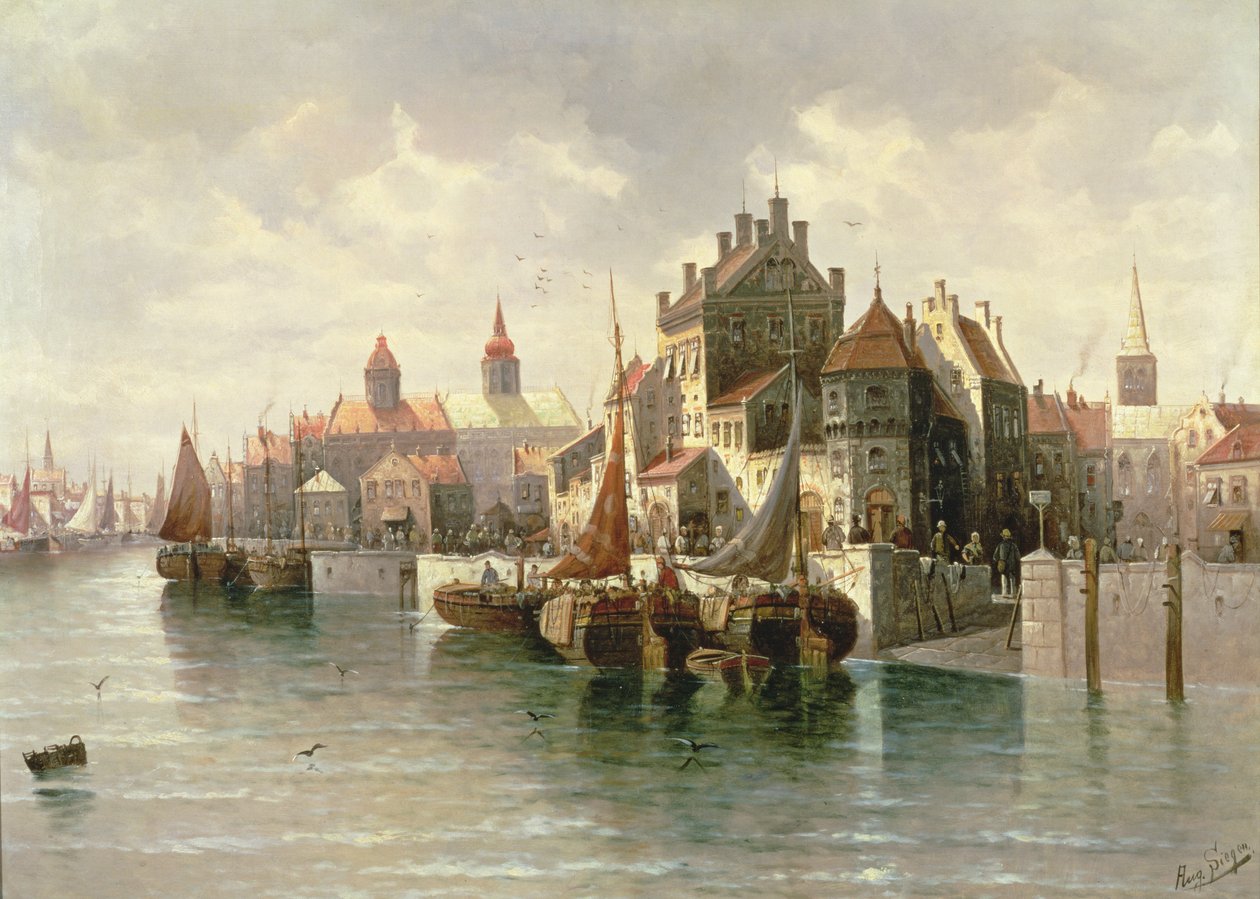Fantasieansicht einer Stadt am Fluss Blick auf Koblenz Hafen von Ostende Imaginäre Ansicht einer Flussstadt mit dem Aachener Dom Winter in Königsberg (Kaliningrad) Capriccio-Ansicht einer niederländischen Stadt an einem Fluss Partie in einer Hafenstadt Amsterdam, Holland De Waag (Waagehaus) und Kran am Spaarne, Haarlem Die Waage und der Kran am Spaarne, Haarlem Aus Barcelona Häuser der Franc Bateliers und Kirche St. Nikolaus am Kanal in Gent, 1845 Dorf am Wasser von William Alexander Meyerheim Imaginäre Ansicht basierend auf der Kolksluis Unbekanntes Bild Befestigte Gebäude am Ufer eines Kanals Königsberg (Kaliningrad) Nördlicher Hafen an einem Schloss mit zahlreichen Lastbooten und Kaufleuten Imaginäre Ansicht basierend auf der Kolksluis, Amsterdam Kai in North Shields, ca. 1890-1910 Die Île de la Cité und der Justizpalast im 16. Jahrhundert, 1917 North River Pierhead Ansicht des Koolvliet in Antwerpen Der Tower von London von der Themse aus gesehen Ein Stück altes Shields, 1898 Le Havre, aus