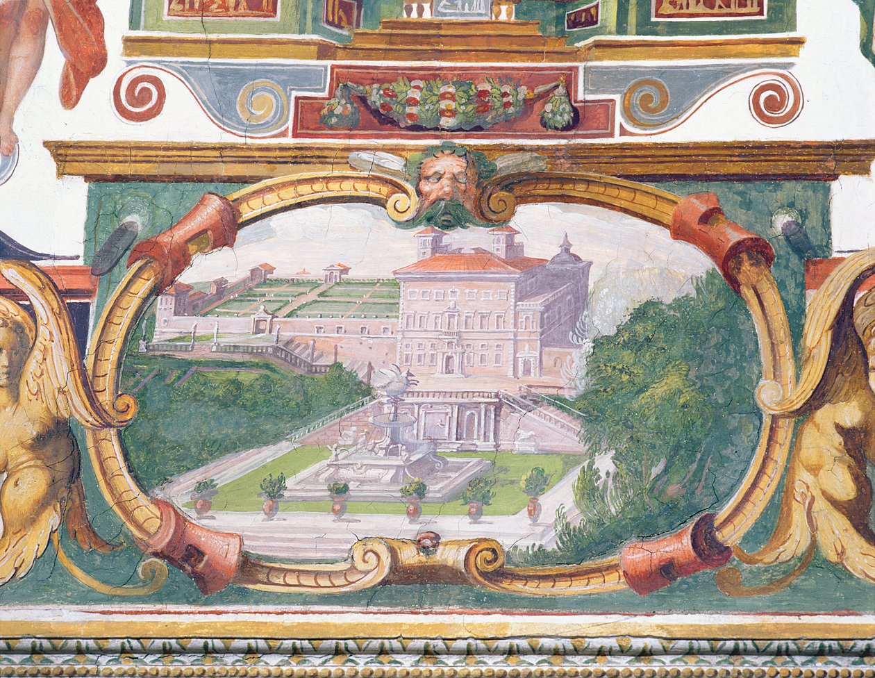 Das Studiolo von Francesco de' Medici (Detail der Friesdekoration mit einer der Medici-Villen, ihrem Garten und Brunnen)(The Studiolo Study of Francesco deMedici 1541-87 detail of the frieze decoration depicting one of the Medici villas, its garden and fountain, 1564-75 fresco)Bartolomeo Ammannati |