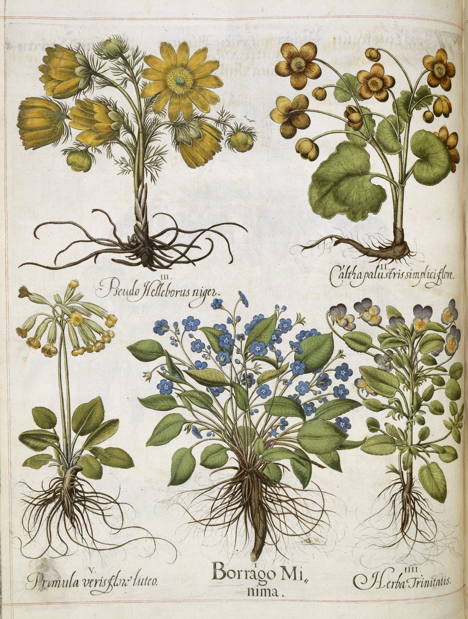 blüte · blüte · blüte · wissenschaft · organismen · pflanze mit namen · pflanzen · blume · blühende pflanze · organismus · blumen · weihnachtsrose · disziplin · kräuter · sumpf · gartenbauliteratur · flora · hortus eystettensis · pflanze · botanik · schlüsselblume · botanisch · naturwissenschaften · feuchtgebiet · feuchtgebiete · ringelblume · primula veris · illustration · caltha palustris · plantae · rose · helleborus · borrago minima · herba trinitatis · gravur · mzengraving · British Library, London, UK / Bridgeman Images