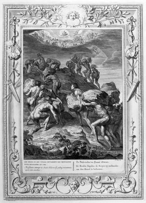 Der Versuch der Riesen, den Himmel zu erklimmen, indem sie Berge aufeinander stapeln, 1733(The giants attempt to scale Heaven by piling mountains upon one another, 1733)Bernard Picart |