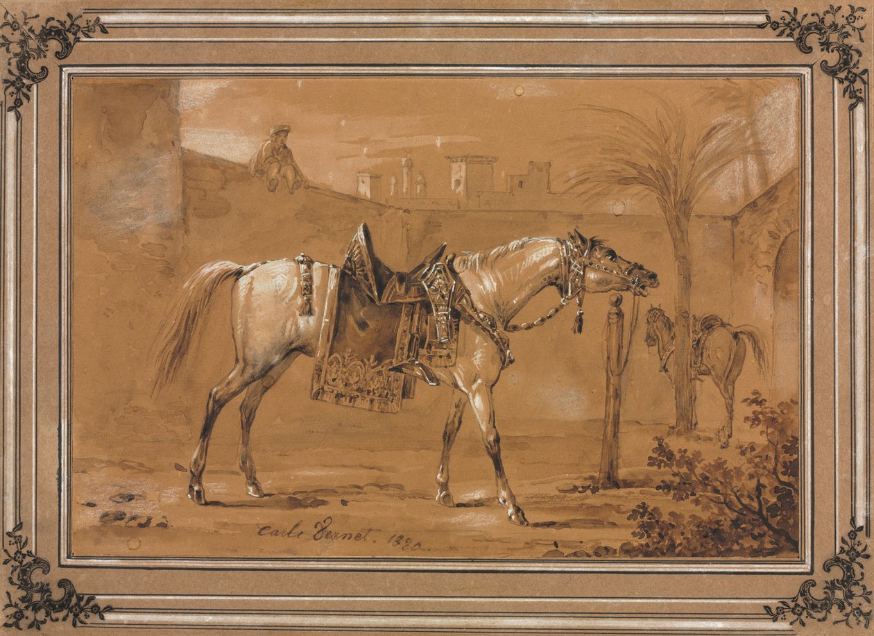 Gesatteltes arabisches Pferd im Hof(Saddled Arabian Horse in Courtyard)Carle Vernet |