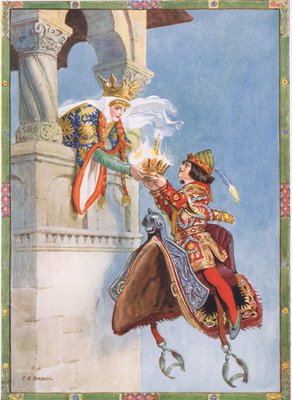 Sie sah die Krone und bat ihn, sie ihr zu geben, Szene aus 'Der Ritter der Blumen' in 'Kindererzählungen aus rumänischen Legenden' von Moses Gaster, 1921(She saw that crown and begged of him to give it her, scene from 'The Knight of the Flowers' in 'Children's Stories from Rumanian Legends' by Moses Gaster (1856-1939) 1921 )Charles Edmund Brock |