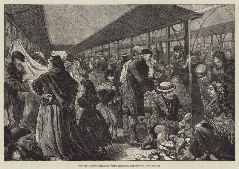 austausch alter kleidung · phils gebäude · houndsditch · nächstenliebe · armut · märkte · london · Private Collection / Bridgeman Images · / Look and Learn