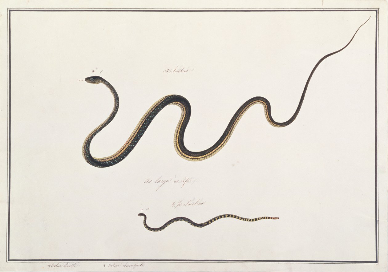 Gemalter Bronzeback mit Banded Malayan Coral Snake, aus Zeichnungen von Tieren, Insekten und Reptilien aus Malakka, um 1805-18(Painted Bronzeback with Banded Malayan Coral Snake, from Drawings of Animals, Insects and Reptiles from Malacca, c.1805-18 (wc & gouache on paper))Chinese School |