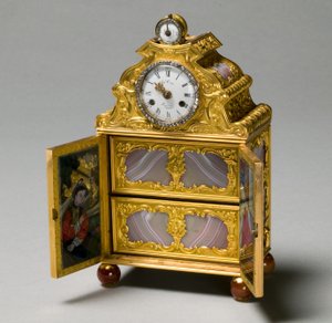 Sehr seltene Ormolu-Musikautomatentischuhr mit Pasteinlagen, wahrscheinlich Guangzhou (ca. 1790)(A very rare ormolu, paste-inset musical automaton table clock, probably Guangzhou, c.1790)Chinese School |