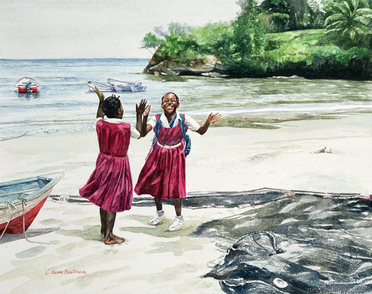 schule · pause · strand · schulmädchen · mädchen · spielen · uniform · schwarz · meer · ufer · lächeln · afroamerikaner · afrikaner · amerikaner · küste · afroamerikaner · schwarze kunst · karibik · boot · boote · malen · aquarell · kind · Kinder · Private Collection / Bridgeman Images |