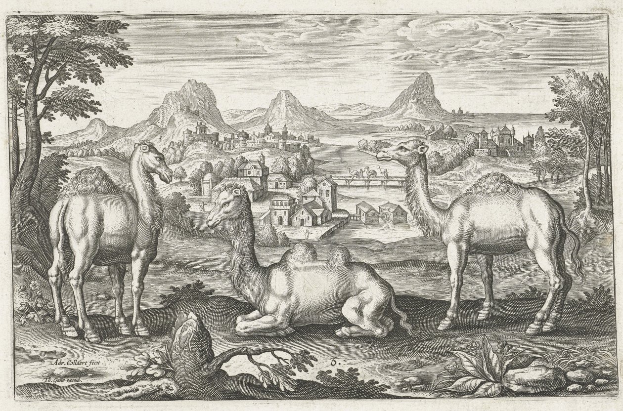 Drei Kamele, graviert von Adriaen Collaert (ca. 1560-1618)(Three Camels, engraved by Adriaen Collaert (c. 1560 ? 1618) )Dutch School |