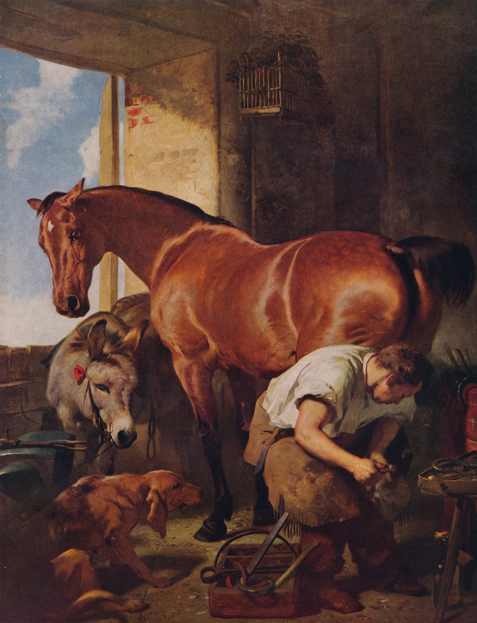 tier · leute · mann · innen · zuhause · funktion · arbeit · mann · männer · neugier · tiere · pferde · pferd · hund · kerl · besetzung · werkzeug · museum · jahrhundert · beruf · nach innen · beständig · dreißiger jahre · esel · konzept · toolbox · schmied · eine person · zurück schauen · publikation · öl anstrich · 19. jahrhundert · dreißiger jahre · 20. jahrhundert · 19.jahrhundert · portrait · shoeing · tate britain · edwin landseer · edwin henry landseer · sie e landseer · e landseer · sir e landseer · landseer · edwin henry · world-famous paintings · j greig pirie · pirie · j greig · The Print Collector/Heritage Images