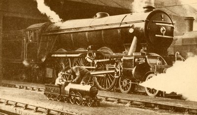 Junge reitet auf einer Spielzeug-Dampflokomotive vor dem echten Ding (s/w Foto)(Boy riding a toy steam locomotive in front of the real thing (b/w photo))English Photographer |