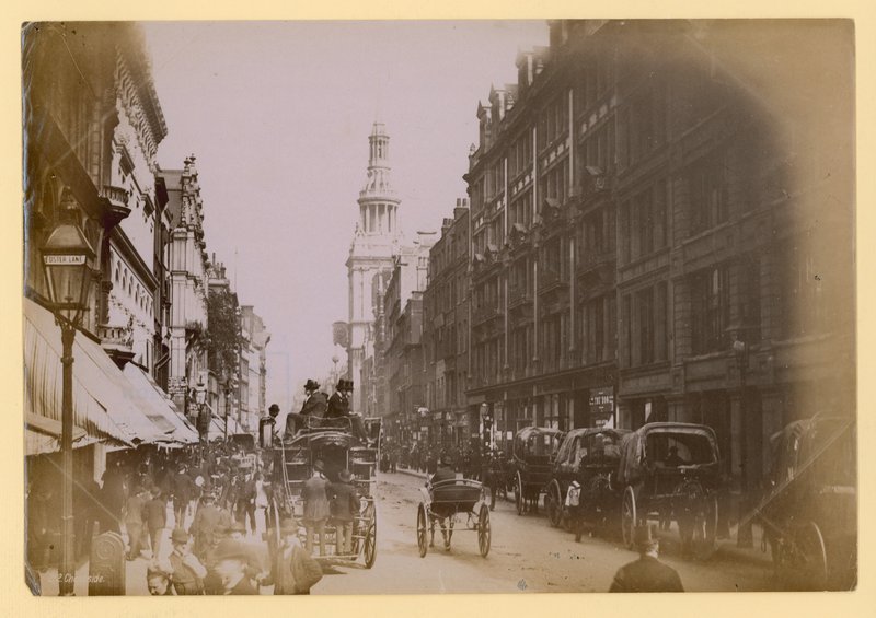 st. mary le bow · cheapside · london · fotografieren · pferd · wagen · gebäude · die architektur · straße · kirche · turm · lampe · Private Collection / Bridgeman Images · / Look and Learn |