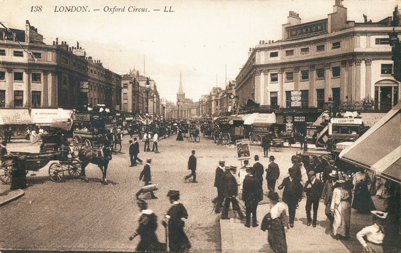 postkarten · jahrhundert · london · england · großbritannien · beschäftigt · straße · szenen · menschen · von pferden gezogen · transport · oxford circus · westende · Private Collection / Bridgeman Images · / Look and Learn