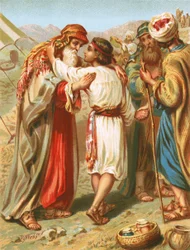 Jakob trennt sich von Benjamin, Genesis, XLIII(Jacob parting from Benjamin, Genesis, XLIII (colour litho))English School |