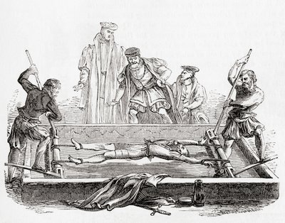 Mann auf der Streckbank, aus 'The National and Domestic History of England' von William Hickman Smith Aubrey, veröffentlicht in London, um 1890(Man being tortured on the rack, from 'The National and Domestic History of England' by William Hickman Smith Aubrey (1858-1916) published London, c.1890 (litho))English School |