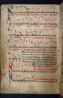Harley MS 978 f.11v Musikalische Sammlung, aus 'Sammlung von Gedichten einschließlich Fabeln und musikalischen, kalendarischen und medizinischen Texten'(Harley MS 978 f.11v Musical Miscellany, from 'Collection of poems including fables and musical, calendrical, and medical texts' (ink & colour on vellum))English School |