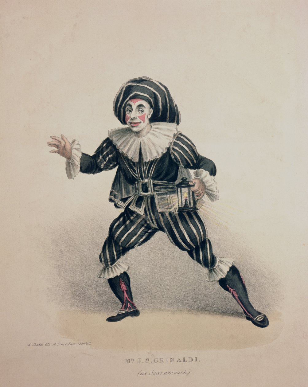 Grimaldi als Scaramouche, aus der Commedia dell'Arte, graviert von A. Chabot, 19. Jahrhundert(Grimaldi as Scaramouche, from the Commedia dellArte, engraved by A. Chabot, 19th century (hand coloured engraving))English School |