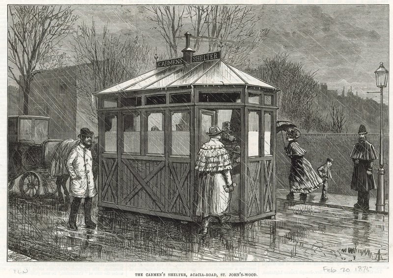 london · transport · reise · taxi · taxifahrer · regen · hütte · akazien-straße · st. john' · s wood · taxifahrer · schutz · Private Collection / Bridgeman Images · / Look and Learn |