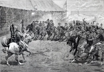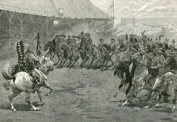 buffalo bill · wild west show · hof des grafen · west brompton · london · grafik · 4. juni 1887 · cowboys · inder · amerikanische ureinwohner · pferde · kostüm · kleidung · unterhaltung · Private Collection / Bridgeman Images · / Look and Learn