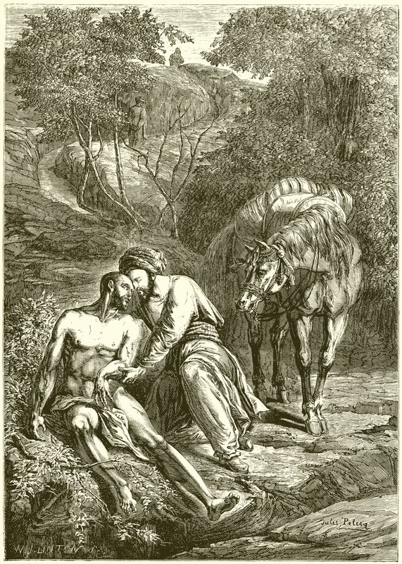 bibel · biblisch · der barmherzige samariter · gleichnis · jesus christus · pferd · krankheit · freundlichkeit · hilfe · hilfe · Private Collection / Bridgeman Images · / Look and Learn
