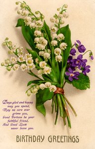 schöne grüße · gruß · karte · neujahr · neujahrskarte · feiern · feierlichkeiten · frohes neues jahr · korb · weidenkorb · schwingen · schwankend · blumen · weiß · blätter · blütenblätter · maiglöckchen · anemone · mit zärtlichem gruß an diesem neujahrstag · Private Collection / Bridgeman Images · / Look and Learn |
