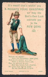 schöne grüße · gruß · karte · weihnachtskarte · weihnachten · feierlichkeiten · feiern · frohe weihnachten · fröhliche weihnachten · noel · weihnachten · die grüße der jahreszeit · mann · sitzung · zusammengesunken · schlafend · betrunken · betrunken · berauscht · regenschirm · trog · pferdetrog · wasser · dew drop inn · W' · ater Nacht muss es gewesen sein · Private Collection / Bridgeman Images · / Look and Learn |