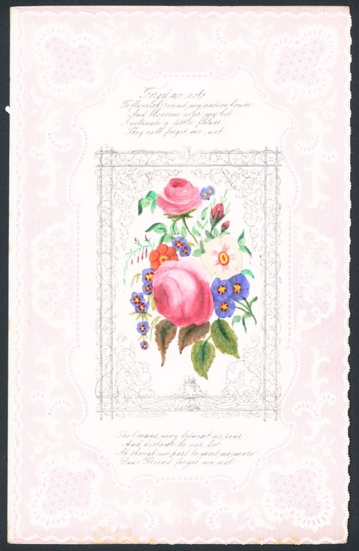 19. jahrhundert · karte · karten · englisch · ephemera · blumen · blume · blumen · nicht · vergessen · nots · vergessen sie mich nicht · vergissmeinnicht · freund · freundschaft · schöne grüße · illustration · abbildungen · spitze · papier · spitzenpapier · lange · entfernung · fern · liebe · ziemlich · romantik · romantisch · heiliger valentin · valentinstag · trennung · sozial · geschichte · st. valentin · valentinstag · valentinstag · valentinstag · valentinstag · viktorianisch · Private Collection / Bridgeman Images · / Look and Learn |