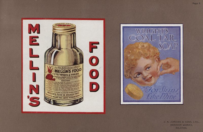marke · marken · werbung · zeichen · etiketten · werbung · viktorianisch · edwardian · emaille · marketing · materialien · mellins essen · kleinkinder · invaliden · stärke · kostenlos · mellin' · s food limited · peckham · london · wright' · s kohlenteerseife · skins · Private Collection / Bridgeman Images · / Look and Learn |