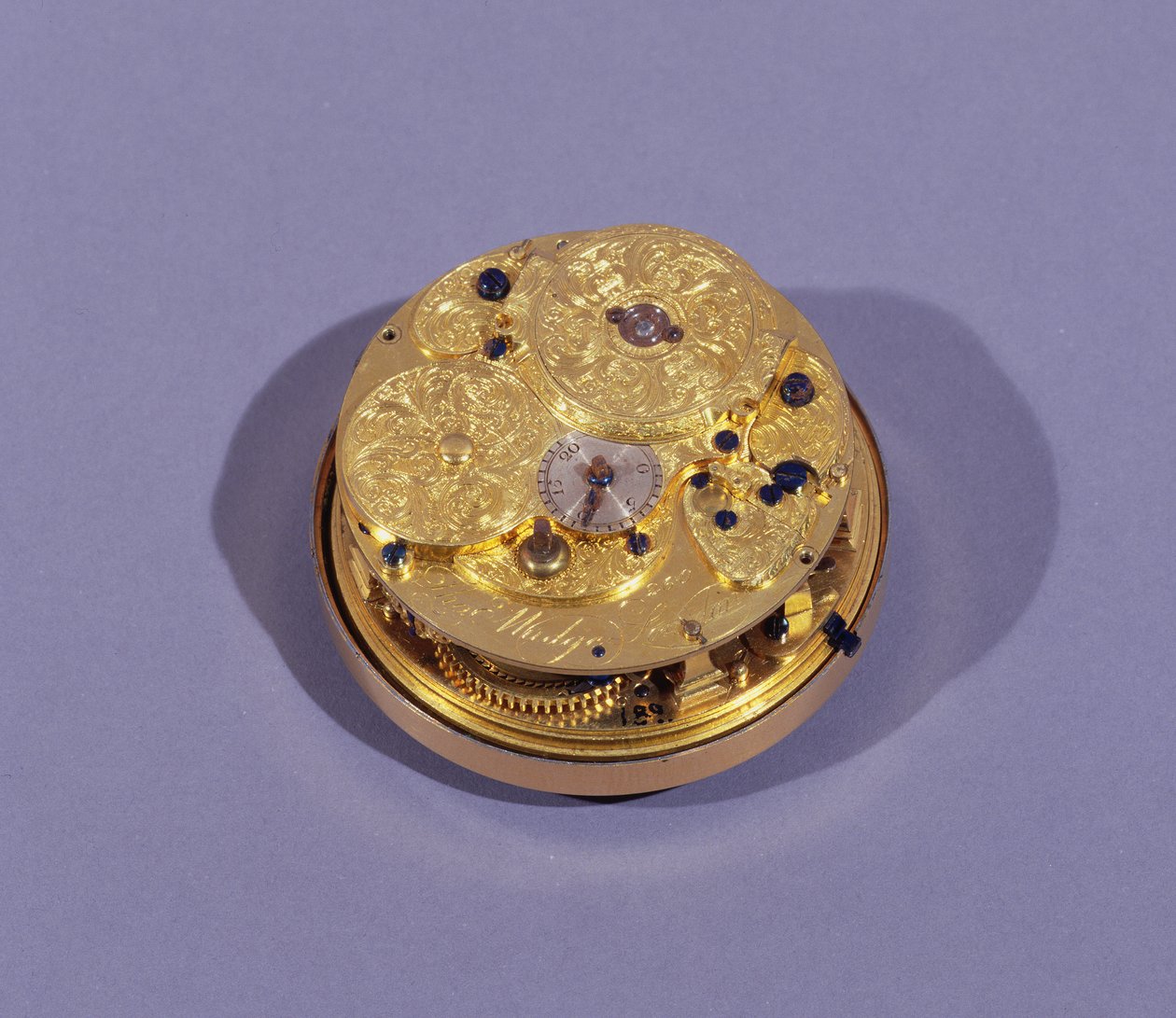 Rückplatte eines Uhrwerks, von Thomas Mudge, London, hergestellt für den König von Spanien, 1755(Backplate of a watch movement, by Thomas Mudge, London, made for the King of Spain, 1755 (brass & enamel) (see also 71012))English School |