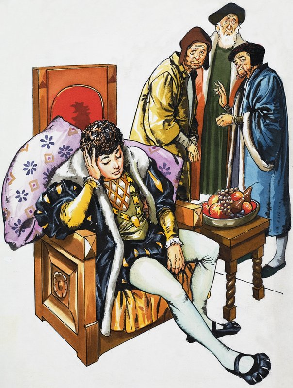 junge · thron · stuhl · kissen · tisch · obst · Private Collection / Bridgeman Images · / Look and Learn |