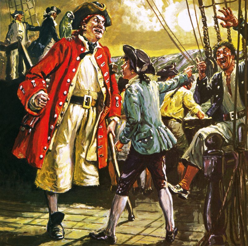 long john silver · treasure island · robert louis stevenson · roman · literatur · meer · schiff · piraten · pirat · takelage · einbeinig · zeigen · abenteuer · Private Collection / Bridgeman Images · / Look and Learn |