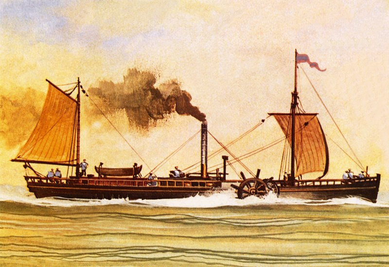 die clermont · das schiff · das erste dampfboot · das passagiere im kommerziellen dienst befördert · robert fulton · der hudson river · Private Collection / Bridgeman Images · / Look and Learn |