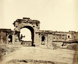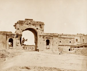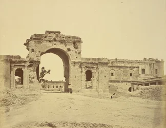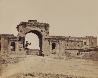 Tor zum Residency, allgemein bekannt als Bailee Guard Gate, gehalten von Lieutenant-Colonel R.H.M. Aitken, der 13. Bengal Native Infantry([Gateway Leading into The Residency, Commonly the Bailee Guard Gate, Held by Lieutenant-Colonel R.H.M. Aitken, of the 13th Bengal Native Infantry])Felice Beato(Photographer) |