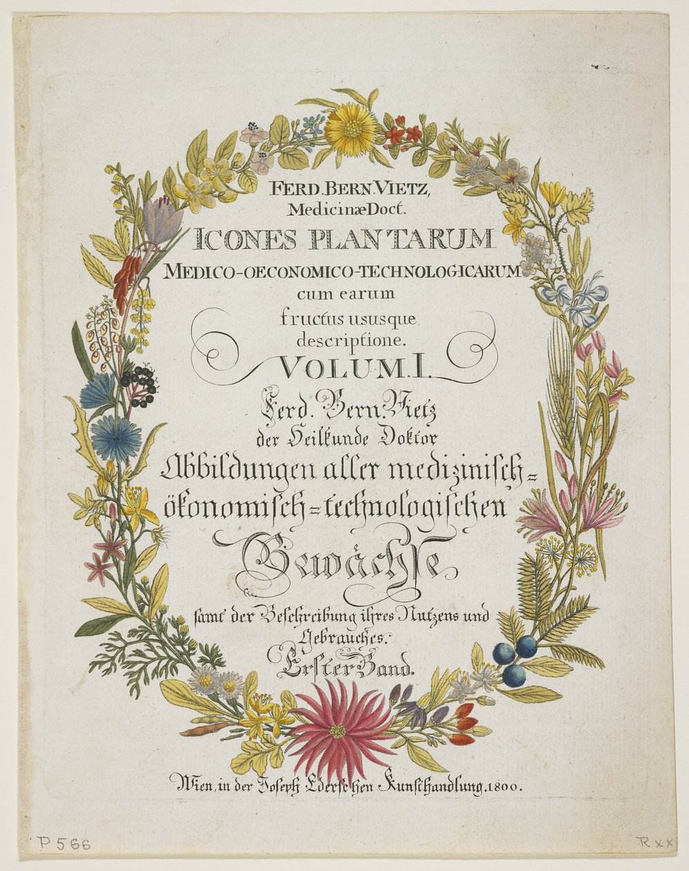 Frontispiz und Titelseite, Bd. I, aus Icones Plantarum Medico-Oeconomico-Technologicarum cum Earum Fructus ususque Descriptione, 1800(Frontispiece and Title Page, Vol. I, from Icones Plantarum Medico-Oeconomico-Technologicarum cum Earum Fructus ususque Descriptione, 1800 (hand-coloured engraving))Ferdinand Bernhard Vietz |