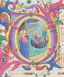 Missale 558 f.9r Historisierte Initiale O, die den wunderbaren Fischfang darstellt(Missal 558 f.9r Historiated initial O depicting the Miraculous Draught of Fishes (detail of 88928))Fra Angelico |