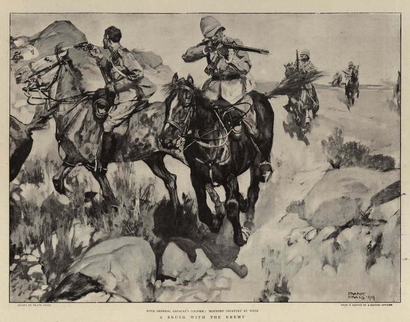 bürste · feind · die kolumne von general gatacre · berittene infanterie · arbeit · militär · pferde · burenkrieg · südafrika · Private Collection / Bridgeman Images · / Look and Learn |