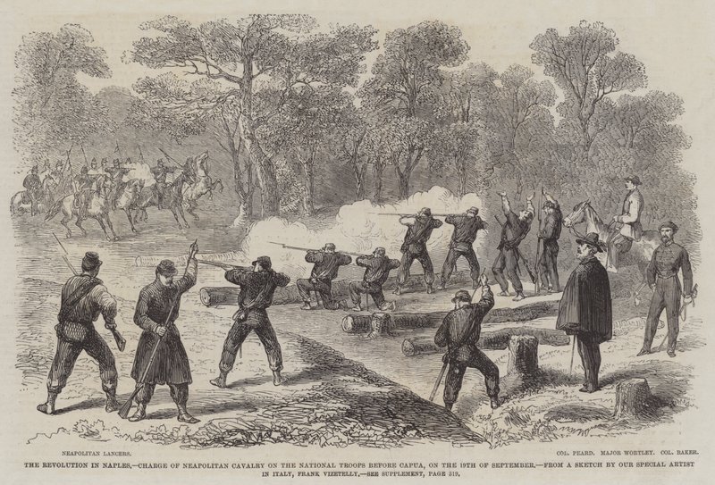 Die Revolution in Neapel, Angriff der neapolitanischen Kavallerie auf die Nationaltruppen vor Capua am 19. September(The Revolution in Naples, Charge of Neapolitan Cavalry on the National Troops before Capua, on the 19 September )Frank Vizetelly |