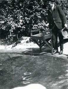 volle länge · seitenansicht · historisch · königspinguin · gießkanne · tierpfleger · harry monro · dusche · vögel · sphenisciformes · spheniscidae (pinguine) · aptenodyten · patagonicus · Königspinguin · Zoological Society of London / Bridgeman Images |