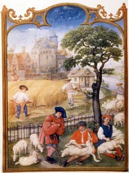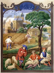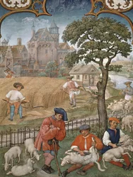Schafschur und Ernte - Miniatur, Mittelalter(Sheep cutting and harvesting - miniature, Middle Ages.)French School |