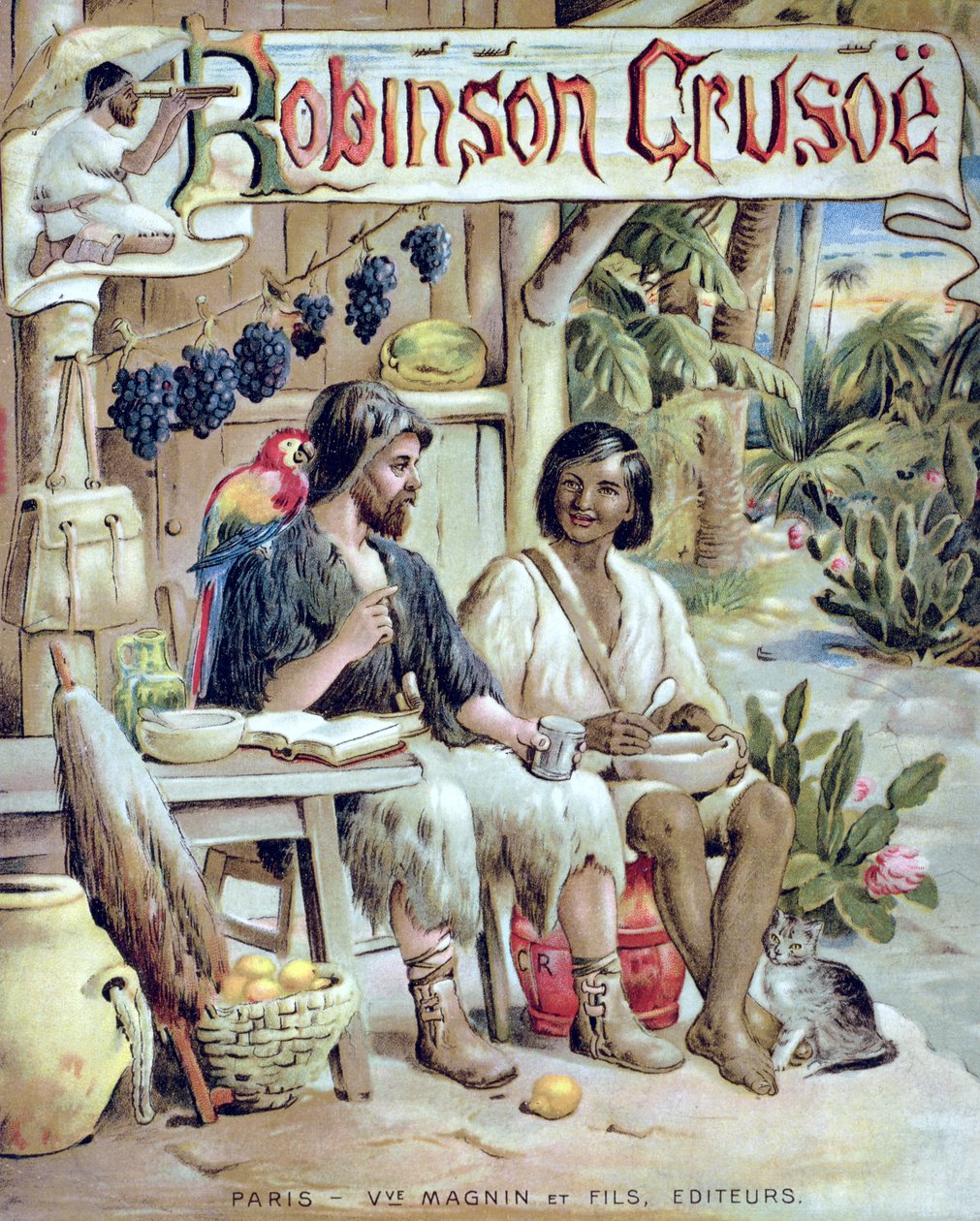 man friday · von daniel defoe · papagei · unterrichten · unterweisen · katze · essen · hütte · trauben · schiffbruch · schiffbruch · strandung · titel · Private Collection / Bridgeman Images |