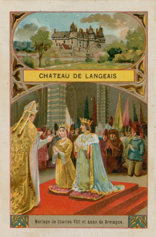 19. jahrhundert · gebäude · gebäude · chateau · französisch · historisch · geschichte · illustration · abbildungen · innere · außen · chateau de langeais · hochzeit · paare · könig · könige · königin · königinnen · charles viii · anne von bretagne · könig von frankreich · freundlich · haus von valois · anne de bretagne · bretonisch · herzogin der bretagne · mittelalter · mittelalterlich · kniend · krone · kronen · 15. jahrhundert · Paar · Private Collection / Bridgeman Images · / Look and Learn |
