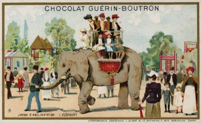 lehrreich · karten · werbe · werbung · handel · karte · schokoladenpoulain · elefant · fahrten · elefanten · tiere · zoos · zoologisch · gardens · menschen · männer · frauen · Private Collection / Bridgeman Images · / Look and Learn