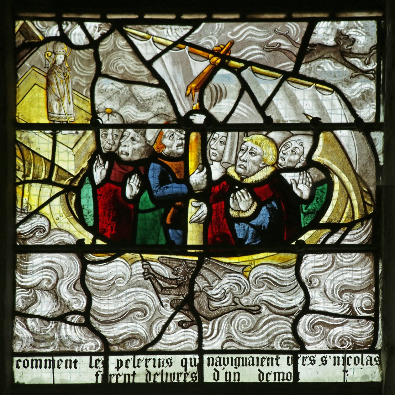 heiliger · schiff · fenster · boot · caudebec en caux · kirche · sturm · wunder · französische schule · glas · reisende · dämonen · meer · glasmalerei · statue · nikolaus · frankreich · Eglise Notre Dame, Caudebec, France / Bridgeman Images