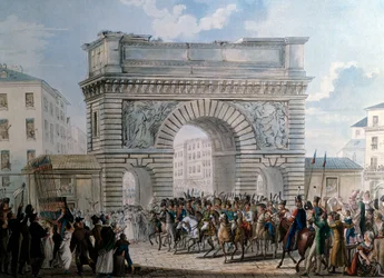 feier · zeremonie · zeremonie · gregorio luigi barnaba chiaramonti · porte st · denis · saint-denis · architektur · gebäude · gebäude · menschenmenge · armee · pferd · pferde · pferdekutsche · menschen · stadt · winken · saint denis · Musee de la Ville de Paris, Musee Carnavalet, Paris, France / Bridgeman Images